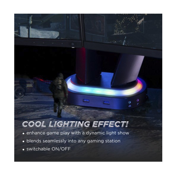 ●Detachable VESA Plate Design: enables easy installation ●Cool Lighting Effect: blends seamlessly into any gaming station ●Built-in Spring Tension Gauge: for perfect weight adjustments ●Built-in Cable Management: for an organized and neat workspace ●2 easily accessible USB 3.0 ports & 2 multi-media Ports ●Spring-Assisted Mechanism: allows to easily move up and down