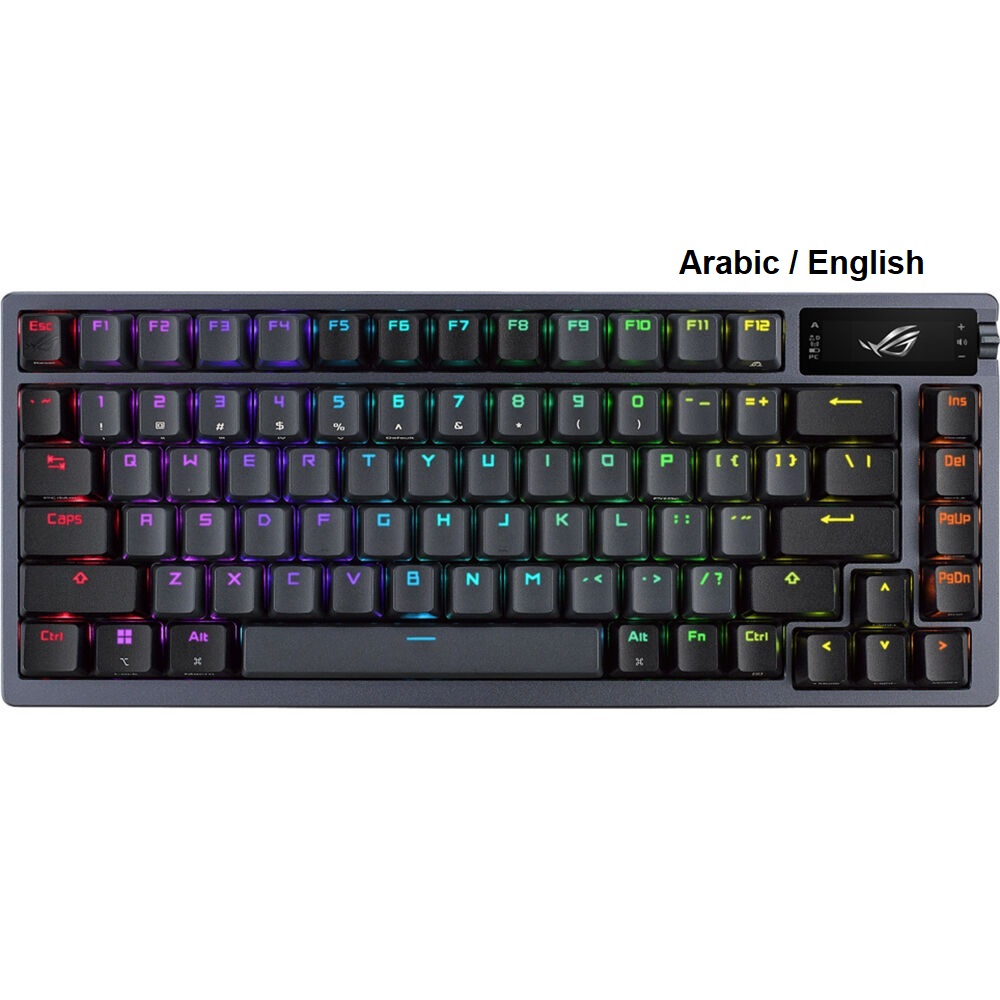 عربي / إنجليزي تصميم فريد من نوعه مع حشية شاشة OLED وأدوات تحكم بديهية مفاتيح ميكانيكية ROG NX قابلة للتبديل السريع اتصال ثلاثي الأوضاع Bluetooth / لاسلكي / سلكي استخدم Bluetooth® للاتصال والتبديل بين ثلاثة أجهزة