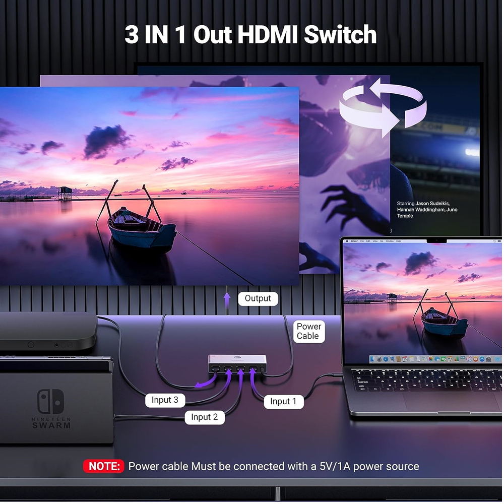 يدعم مقسم HDMI توصيل 3 مصادر HDMI بشاشة HDMI واحدة، مما يحافظ على جميع معدات HDMI الخاصة بك ذات صلة ومفيدة. إنه يزيل متاعب فصل الكابلات وإعادة توصيلها، ويساعد على تقليل التآكل ويطيل عمر معداتك. ملاحظة: لا يعمل محول UGREEN HDMI هذا من مصدر واحد إلى شاشات متعددة. كابل طاقة USB A إلى DC (5 فولت/1 أمبير) متضمن، لكن كابلات HDMI ومحول الطاقة غير متضمنين.