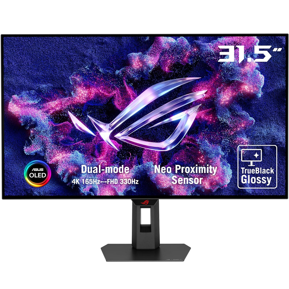 ROG Strix OLED XG32UCWG gaming monitor ―32-inch (31.5-inch viewable) 4K TrueBlack Glossy™ OLED, dual mode (4K@165Hz, FHD@330Hz), 0.03ms (GTG), G-SYNC® compatible, custom heatsink, OLED Care Pro, Neo Proximity Sensor, VESA DisplayHDR™ 400 True Black, Auto KVM, USB Type-C®