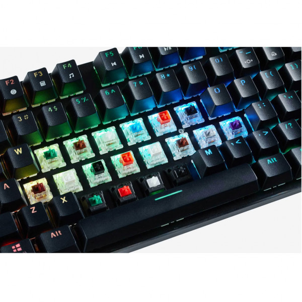 Full modular, mechanical keys Hot-swappable switches. Easily remove and install any MX-based switch without any soldering. Personalize to what works for you, and use any combinations of switches! LED Backlighting RGB LED lights with 18 pre-installed effects and 1 slot for user-defined effect. Variable animation speeds and brightness settings. Directly access shortcuts to productivity, internet and multimedia functions